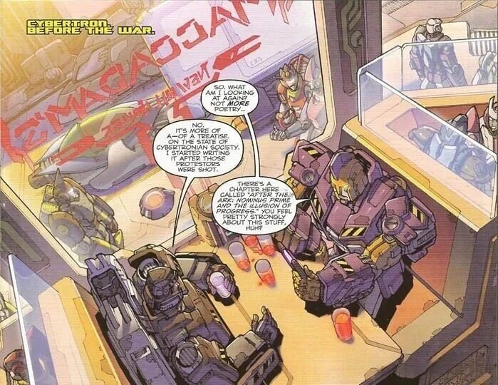 In the 2011 IDW comic Chaos Theory, set just before the great war, the Old Oil House goes by another name: Maccadam’s New Oil House. It’s here that Ultra Magnus sits with Megatron — who is still a miner at the time — to discuss a paper advocating for non-violent revolution. The author of that paper? None other than Megatron himself, the future face of the Decepticons.