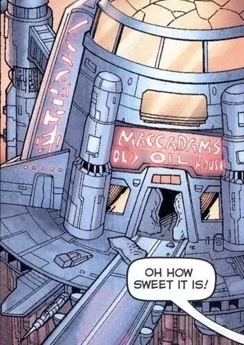 For the Wreckers, Maccadam’s Old Oil House is one of the few places where they can let their guard down and shed their armor. The bar made its first appearance in the Marvel UK Transformers comic Target: 2006. In the story, Operation Volcano is forced to abort, and the disheartened Twintwist, Roadbuster, and Whirl walk into the bar, looking only to drown their sorrows in fuel.