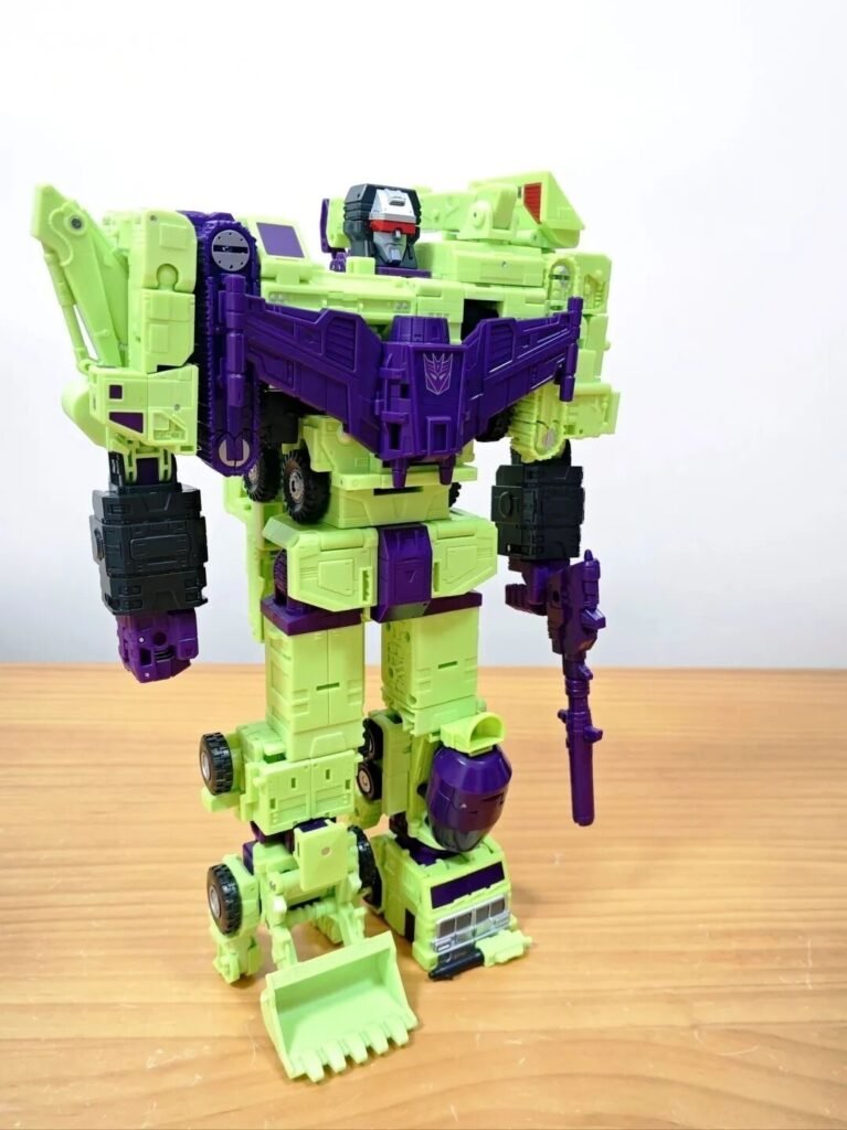 Let’s talk about the design and setting inconsistencies of Devastator, the first iconic combiner transformer to debut in Transformers G1. For anyone who’s owned a G1 Devastator figure, it’s a well-known fact that Scrapper the front loader—its leader—transforms into one of Devastator’s legs, bearing half of the giant combiner’s total weight. This creates a major design challenge: the load-bearing capacity of Scrapper’s combined leg structure.