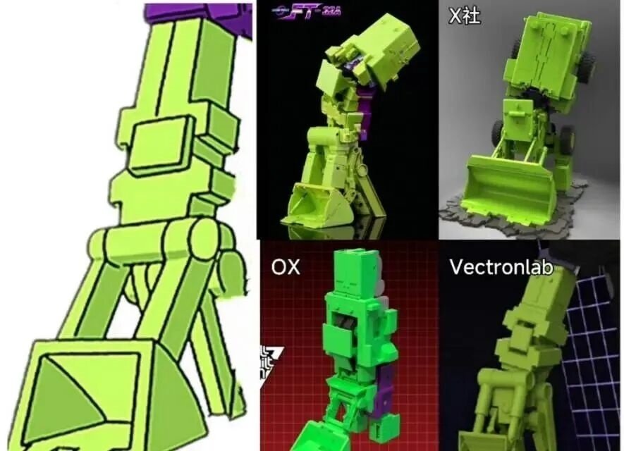 We’ll dive into Devastator’s toy iterations later, and let’s start with the original concept art first. The base of Scrapper’s combined leg is supported by two slanted rear components and a large slanted front bucket. Triangular structures are inherently stable in theory, yet there’s a critical flaw here: only the upper two sides of the triangle are present, with no connecting component at the bottom to form a complete triangular frame. What does this flaw reveal? It means that any physical toy designed to match this concept must be modified. Either the slanted parts are redesigned as straight supports, additional components are added at the bottom to create a solid triangular frame, or large pieces like an upgrade kit are used directly to reinforce the structure. Without such adjustments, how could this giant combiner transformer achieve sufficient stability with this original G1 setting?