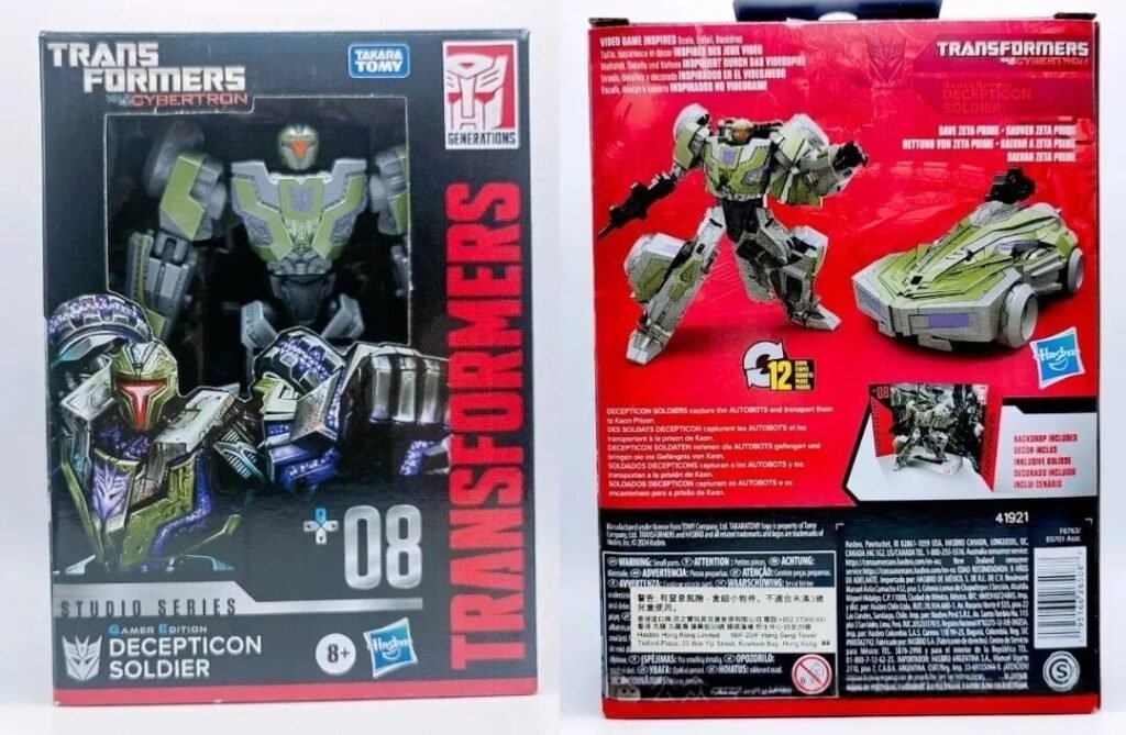 The toy’s packaging is still this version that retains the toy number. There’s a hollowed-out window in the center of the box, and you can see the main body of the toy through this window. Below the window is a standing illustration of the Decepticon Trooper. Unlike other characters – whose standing illustrations we most likely would have seen in the game – this Trooper’s illustration, if I remember correctly, isn’t present in the game at all.